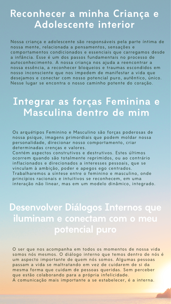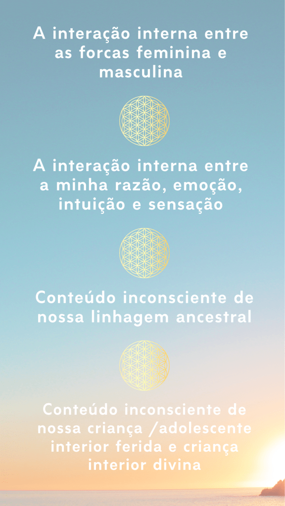 Jornada de 4 encontros de aprox. 2 horas cada, em grupo ou individual, com o propósito de despertar diálogos internos mais conscientes, harmoniosos e construtivos. Equilibrando Razão, Emoção, Intuição e Sensação. Harmonizando a Comunicação & Convivência social. Integrando as forças Feminina & Masculina. Com base na Psicologia Transpessoal, Arteterapia, Meditação focada e Respiração conectada.